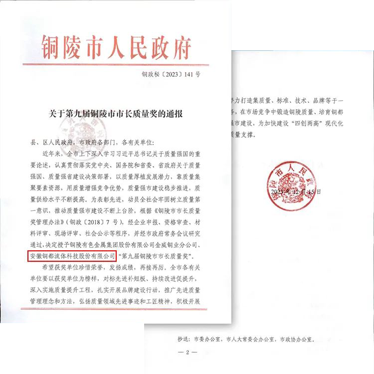 日前,安徽銅都流體科技股份有限公司榮獲第九屆銅陵市市長(zhǎng)質(zhì)量獎(jiǎng)。