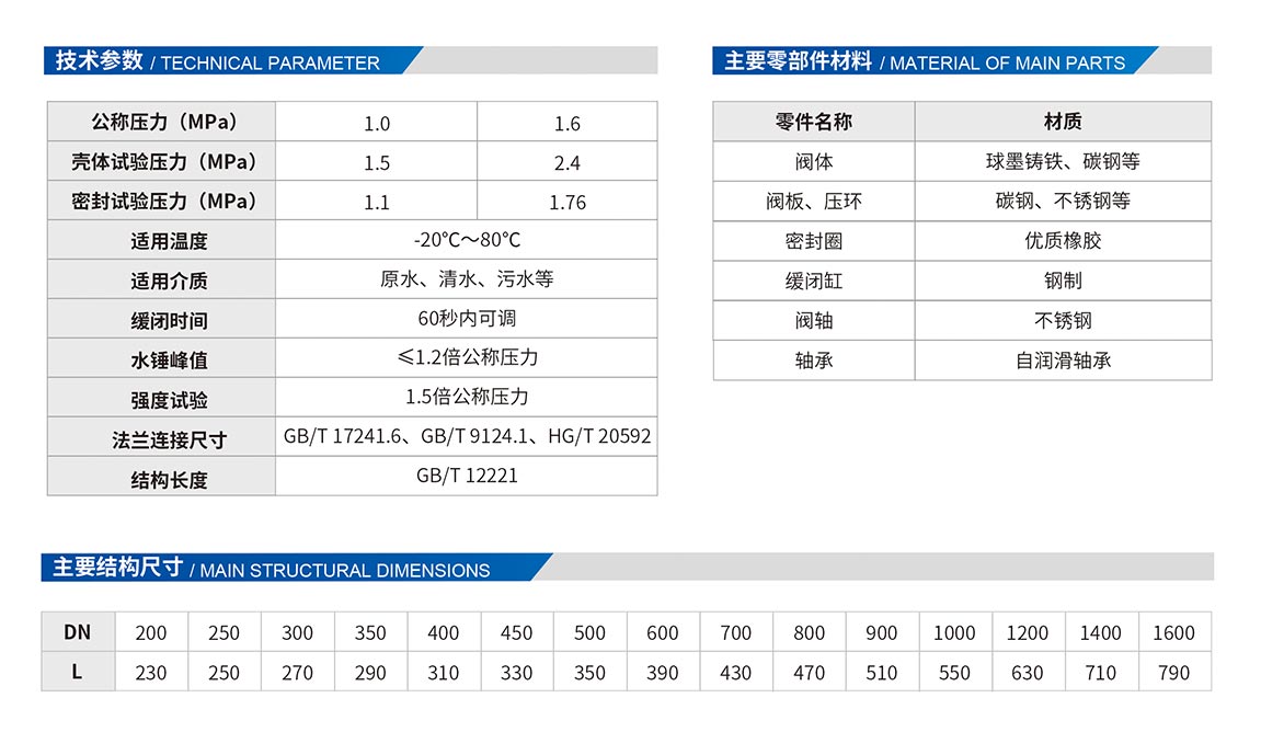蝶形緩閉止回閥主要用于凈水、原水、污水、海水等介質(zhì)的供、排水管道上,安裝在水泵出口處,用以截斷介質(zhì)的回流,消除水錘,保護管道、水泵的安全運行。其主要特點:體形小、重量輕、結構長度只有旋啟式止回閥的三分之一左右。帶外置阻尼油缸,緩閉性能優(yōu)良,不受管道中介質(zhì)的影響,閥瓣先速關后緩閉,可防止破環(huán)性水錘。橡膠軟密封,結構密封性能好,耐磨損,使用壽命長。橡膠緩沖,運行平穩(wěn),無震動及噪音,比老式止回閥流阻小,有明顯的節(jié)能效果。